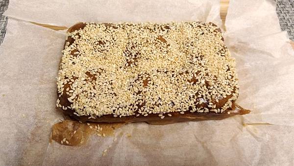 若沒有沾黏趁熱撒上白芝麻後取出放涼