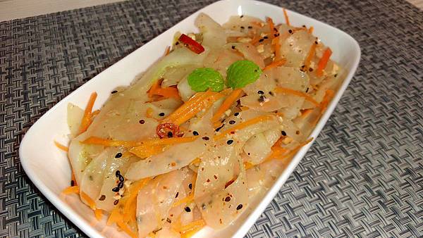 (4)將泡冰水的大黃瓜及紅蘿蔔絲瀝乾後加入辣椒絲