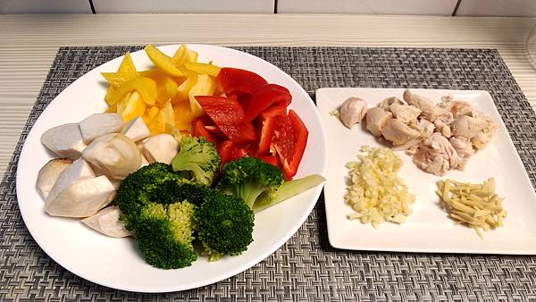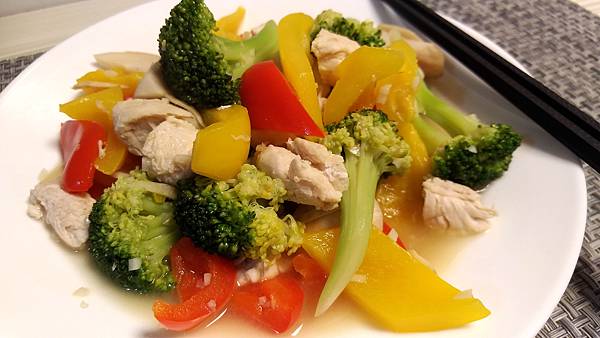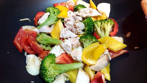 接著依序下杏鮑菇、甜椒、雞胸肉、花椰菜翻炒後