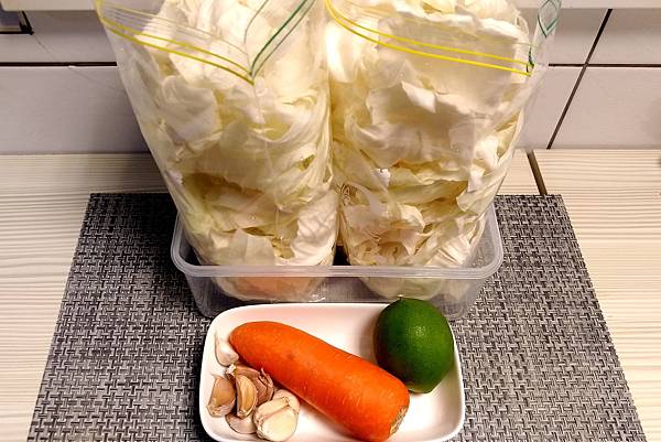 高麗菜1顆(約600g)、胡蘿蔔一根、蒜頭10辦、辣椒適量、塩1T