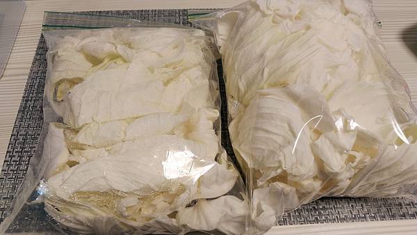 將高麗菜洗淨,撥片,稍掠乾後把高麗菜放入乾淨的塑膠袋中