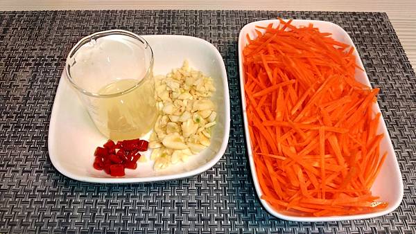 紅蘿蔔切絲、蒜頭切末、辣椒切段、檸檬擠汁
