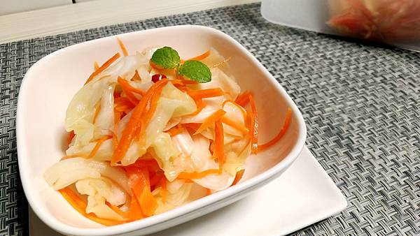 將高麗菜及胡蘿蔔濾乾後放入醬汁後拌均勻裝入密封袋中