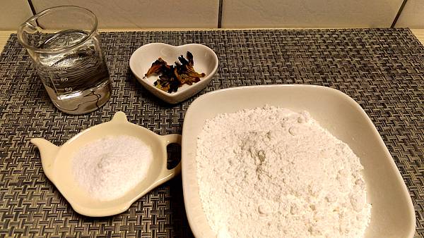 蝶豆花10朵.地瓜粉70g.太白粉30g.海藻糖2t.滾水100ml