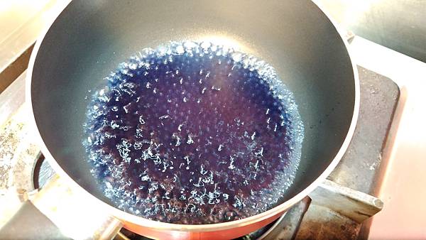 蝶豆花加入熱水顏色煮出後加入海藻糖煮成花茶(要煮滾)