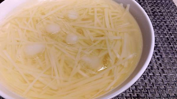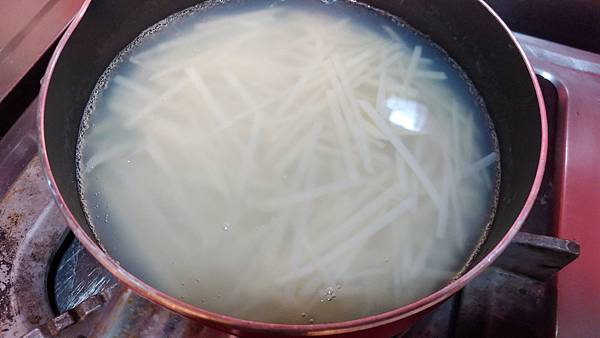 熱水滾後,放入馬鈴薯絲川燙約30秒 (不可以太久喔!)