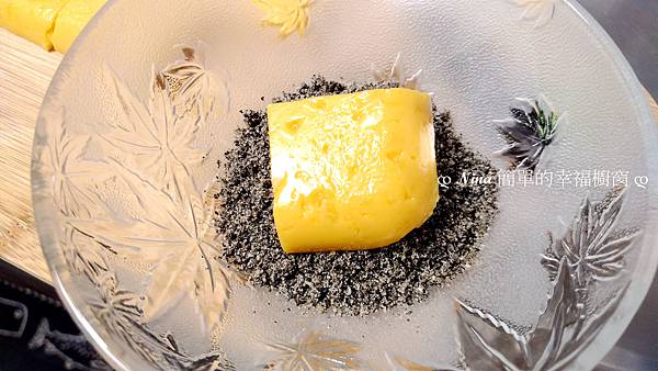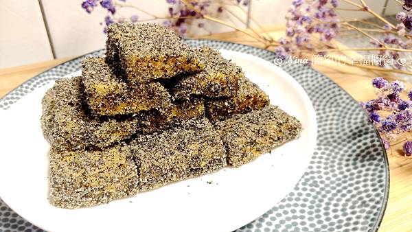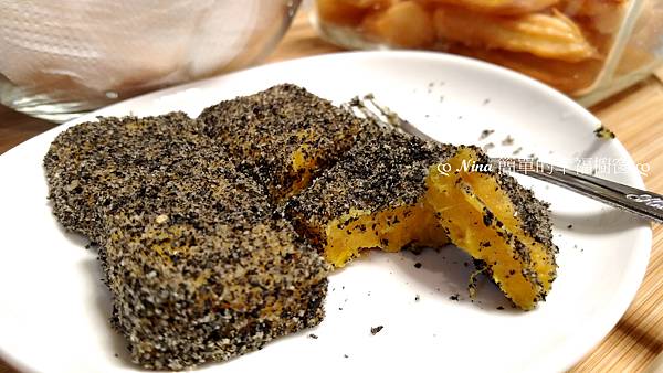 在碗盤中倒入芝麻粉再將南瓜糕放入均勻沾取粉末即可