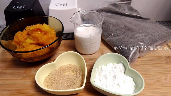 南瓜泥150g.玉米粉15g.牛奶80g.砂糖15g.芝麻粉適量