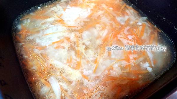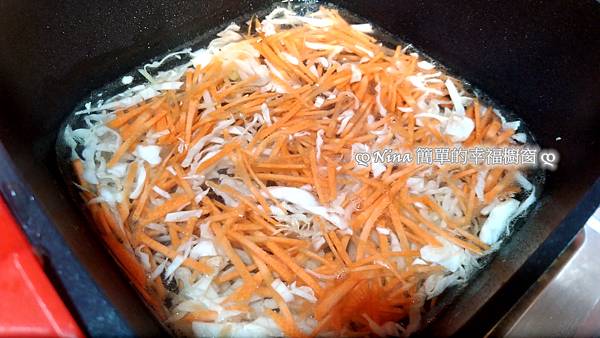 待冷水滾後放入紅蘿蔔絲及高麗菜絲